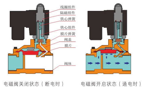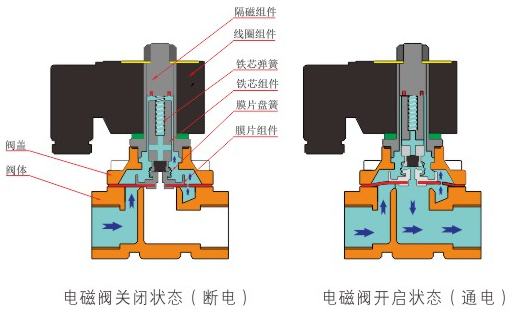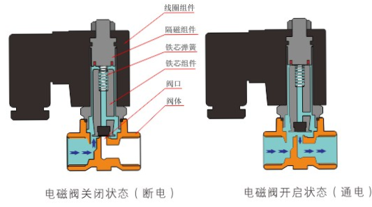 原理:米兰官方端网站登录入口-米兰(中国)直动式电磁阀分常闭型和常开型两种。常闭型电磁阀断电时为关闭状态,线圈通电时产生电磁力,动铁芯跟静铁芯吸合,电磁阀阀口打开,介质(流体)通过;当电磁阀线圈断电时电磁阀消失,在弹簧的作用力下,电磁阀动铁芯复位,阀口关闭,介质(流体)不同,电磁阀呈关闭状态。常开型与之相反。